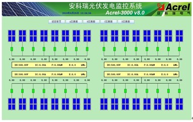2.2.2 光伏電站電力監控係統 Acrel-2000 V8.0光伏發電監測係統是上海安科瑞電氣股份有限公司針對太陽能發電係統開發的軟件平台,可對太陽能光伏電站裏的電池陣列、彙流箱、逆變器、交直流配電櫃、太陽跟蹤控製係統等設備進行實時監測和控製,通過各種樣式的圖表及數據快速掌握電站的運行情況,其友好的用戶界麵、強大的分析功能、完善的故障報警確保了太陽能光伏發電係統的完全可靠和穩定運行。