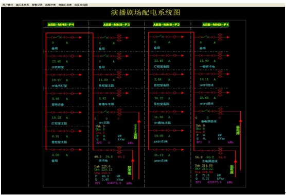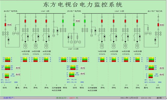 上海東方電視台電力監控係統實現了10KV高壓配電間、演播劇場配電間、節目中心UPS機房、技術低壓配電室、柴油發電機房等各進線及饋線回路的一次係統圖顯示、高壓光字牌、動態實時模擬屏、各回路實時電參量遙測、重要回路電能報表、主進線回路的負荷用電趨勢、重要回路的分合閘報警、電流越限報警、用戶權限管理等功能,軟件運行界麵見下圖。