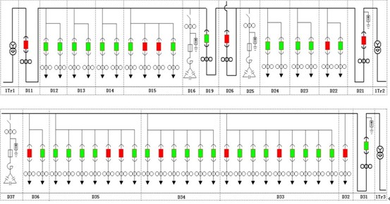 整個低壓配電係統包括20個低壓配電櫃。其中三個進線櫃,三個電容補償櫃,兩個母聯和12個出線櫃。12個出線回路的負載基本上是三相大功率電機。