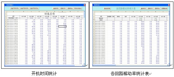 設備的稼動率報表功能窗口顯示的是單個回路的開機時間和稼動率值,也就是把功率曲線的各個數據進行加工,然後做成EXCEL表(biao)格(ge)的(de)形(xing)式(shi)展(zhan)示(shi)出(chu)來(lai),兩(liang)者(zhe)相(xiang)互(hu)呼(hu)應(ying),以(yi)便(bian)生(sheng)產(chan)管(guan)理(li)者(zhe)對(dui)員(yuan)工(gong)進(jin)行(xing)考(kao)核(he)。從(cong)該(gai)表(biao)格(ge)和(he)曲(qu)線(xian)可(ke)以(yi)明(ming)顯(xian)的(de)看(kan)出(chu)設(she)備(bei)在(zai)什(shen)麼(me)時(shi)候(hou)處(chu)於(yu)開(kai)機(ji)狀(zhuang)態(tai),其(qi)中(zhong)有(you)多(duo)長(chang)時(shi)間(jian)是(shi)處(chu)於(yu)生(sheng)產(chan)期(qi),多(duo)長(chang)時(shi)間(jian)處(chu)於(yu)閑(xian)置(zhi)期(qi),很(hen)容(rong)易(yi)的(de)就(jiu)能(neng)掌(zhang)握(wo)員(yuan)工(gong)的(de)工(gong)作(zuo)情(qing)況(kuang)。對(dui)單(dan)個(ge)的(de)設(she)備(bei)進(jin)行(xing)詳(xiang)細(xi)的(de)數(shu)據(ju)展(zhan)示(shi)後(hou),還(hai)有(you)一(yi)個(ge)總(zong)的(de)設(she)備(bei)數(shu)據(ju)展(zhan)示(shi)功(gong)能(neng)窗(chuang)口(kou),如(ru)下(xia)圖(tu)示(shi):