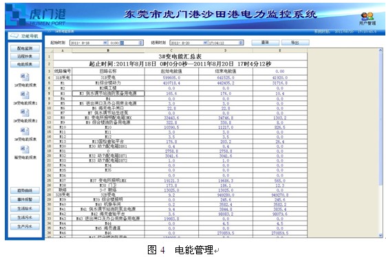 圖4所(suo)示(shi)為(wei)電(dian)能(neng)彙(hui)總(zong)報(bao)表(biao),列(lie)出(chu)各(ge)回(hui)路(lu)電(dian)能(neng)數(shu)據(ju),方(fang)便(bian)客(ke)戶(hu)查(zha)詢(xun)和(he)打(da)印(yin)。根(gen)據(ju)業(ye)主(zhu)需(xu)求(qiu)可(ke)以(yi)查(zha)看(kan)日(ri)報(bao)表(biao),月(yue)報(bao)表(biao),年(nian)報(bao)表(biao)。清(qing)晰(xi)了(le)解(jie)各(ge)用(yong)電(dian)單(dan)位(wei)在(zai)某(mou)一(yi)時(shi)間(jian)段(duan)內(nei)的(de)用(yong)電(dian)狀(zhuang)況(kuang),為(wei)決(jue)策(ce)層(ceng)節(jie)能(neng)減(jian)排(pai)提(ti)供(gong)數(shu)據(ju)依(yi)據(ju)。