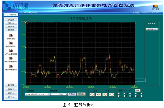負fu荷he趨qu勢shi曲qu線xian提ti供gong了le某mou一yi段duan時shi間jian內nei該gai回hui路lu的de負fu荷he趨qu勢shi,方fang便bian管guan理li員yuan掌zhang握wo用yong電dian設she備bei的de運yun行xing狀zhuang況kuang,對dui存cun在zai故gu障zhang隱yin患huan的de設she備bei及ji時shi提ti出chu整zheng改gai,對dui不bu合he理li用yong電dian單dan位wei提ti出chu科ke學xue合he理li的de改gai進jin。如ru圖tu5所示: