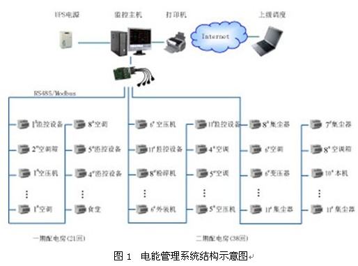 3.2 電能管理需求分析及係統構成 某公司廠房共有一期配電房1個、二期配電房2個,提供全廠的生產、照明、空(kong)調(tiao)用(yong)電(dian)及(ji)其(qi)它(ta)用(yong)電(dian)等(deng)。原(yuan)有(you)配(pei)電(dian)係(xi)統(tong)隻(zhi)在(zai)全(quan)廠(chang)總(zong)進(jin)線(xian)回(hui)路(lu)上(shang)裝(zhuang)有(you)電(dian)力(li)部(bu)門(men)的(de)電(dian)度(du)表(biao),管(guan)理(li)者(zhe)隻(zhi)能(neng)從(cong)每(mei)個(ge)月(yue)電(dian)力(li)部(bu)門(men)提(ti)供(gong)的(de)用(yong)電(dian)總(zong)數(shu)值(zhi)得(de)知(zhi)本(ben)月(yue)電(dian)量(liang)能(neng)耗(hao),至(zhi)於(yu)電(dian)能(neng)都(dou)用(yong)在(zai)了(le)什(shen)麼(me)地(di)方(fang),有(you)沒(mei)有(you)電(dian)能(neng)浪(lang)費(fei),節(jie)能(neng)措(cuo)施(shi)有(you)沒(mei)有(you)收(shou)到(dao)應(ying)有(you)的(de)效(xiao)果(guo),企(qi)業(ye)管(guan)理(li)者(zhe)不(bu)是(shi)很(hen)清(qing)楚(chu)。亟(ji)待(dai)一(yi)個(ge)合(he)理(li)的(de)電(dian)能(neng)考(kao)核(he)機(ji)製(zhi)來(lai)實(shi)現(xian)電(dian)能(neng)的(de)科(ke)學(xue)管(guan)理(li)。