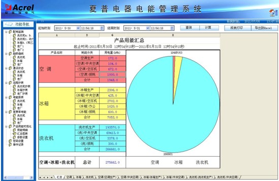 通過彙總圖表分析功能,用戶可以查看設定時間段內分類彙總的空調、冰(bing)箱(xiang)和(he)洗(xi)衣(yi)機(ji)的(de)彙(hui)總(zong)用(yong)電(dian)量(liang),並(bing)以(yi)柱(zhu)狀(zhuang)圖(tu)或(huo)者(zhe)餅(bing)圖(tu)的(de)方(fang)式(shi)直(zhi)觀(guan)顯(xian)示(shi)出(chu)來(lai)。也(ye)可(ke)以(yi)更(geng)進(jin)一(yi)步(bu)的(de)查(zha)看(kan)各(ge)分(fen)類(lei)用(yong)電(dian)設(she)備(bei)中(zhong)每(mei)一(yi)台(tai)設(she)備(bei)的(de)任(ren)意(yi)時(shi)段(duan)用(yong)電(dian)量(liang),並(bing)以(yi)柱(zhu)狀(zhuang)圖(tu)顯(xian)示(shi),確(que)定(ding)高(gao)耗(hao)能(neng)設(she)備(bei)。