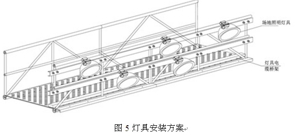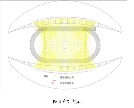 通過按照不同的配光曲線組合,按光衰周期開啟不同數量的燈具,實現等照度控製,以節約電能,比較結果如圖3所示。按初始光通量100%到維持光通量70%進行計算共3 000 h,從初始光通量每5%(即每500 h),fenwujimoshizhaoming,shezhikaidengmoshijinxingkongzhi,tongshidianlijiankongxitongdui毎zhandengdekaidengshijianjinxingjilu,anzuiyoufangshikongzhi毎zhandengdezongkaidengshijian,zuodao480盞燈具壽命同期,避免傳統的賽場照明控製方式使個別燈組的燈具開燈時間過長,提前老化,延長了賽場照明的整體換燈周期,布燈方案如圖4所suo示shi。為wei保bao證zheng恒heng照zhao度du模mo式shi下xia的de賽sai場chang照zhao明ming均jun勻yun度du,照zhao明ming設she計ji軟ruan件jian進jin行xing了le大da量liang的de模mo擬ni計ji算suan,優you化hua出chu最zui佳jia的de燈deng具ju組zu合he,同tong時shi設she置zhi要yao求qiu在zai毎毎盞zhan燈deng上shang配pei置zhi對dui光guang裝zhuang置zhi,可ke按an方fang便bian地di調tiao整zheng毎毎盞zhan燈deng的de靶ba心xin,以yi保bao證zheng賽sai場chang的de照zhao度du均jun勻yun。燈deng具ju安an裝zhuang如ru圖tu5、圖6所示。