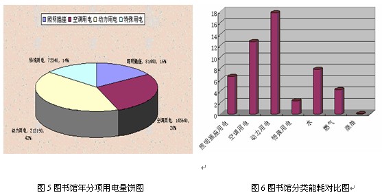 圖4為圖書館能耗監測係統的主界麵,可以查詢各類能耗的使用狀況,表2給出了圖書館能耗數據查詢表,很清楚的顯示出各類能源的使用情況。圖5為係統給出的圖書館照明、空調及插座等用電量的餅圖,很直觀地顯示出分項用電量的百分比。而圖6是根據係統采集的所有分類能耗數據,由係統繪製出的分類能耗柱形圖,可以形象的看出分類能源的使用情況。