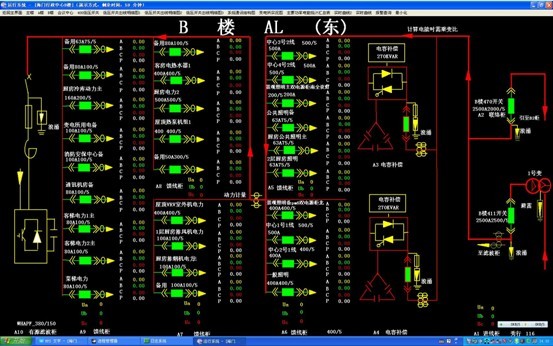 係統提供簡單、易用、良好的用戶使用界麵。采用全中文界麵,CAD圖形顯示低壓配電係統電氣一次主接線圖,顯示配電係統設備狀態及相應實時運行參數;畫麵實時動態刷新;模擬量顯示等。
