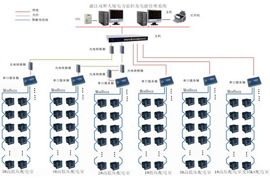 各智能電力儀表通過屏蔽雙絞線RS485接口,采用MODBUS通訊協議總線型連接接入通訊服務器。然後35kv配電室、1#配電室高低壓部分和5#配電室高低壓部分通過網線直接與值班室的工業交換機相連, 3#高低壓部分通過光纜直接與值班室的工業交換機相連,4#高低壓部分通過光纜先連到2#配電室,再和2#高低壓部分一起通過光纜一起連到值班室的工業交換機。最後工業交換機通過網線連到值班室的兩台主機。