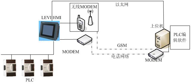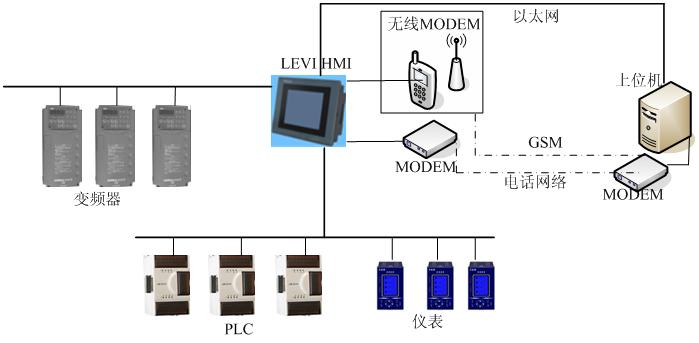 在該架構中,LEVI HMI處於所有設備的中間,主要起到一個橋接的作用。通過電話、GSM、以太網等網絡形式,上位機可以隨時與遠程的PLC、變頻器、儀表等設備進行通信、調試,效果和在本地調試一樣。這樣有效的減少了維護成本與時間。