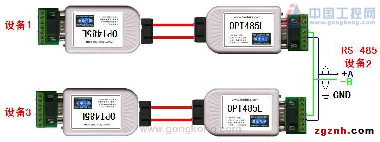 典型應用1:在圖2中,串口設備1與串口設備3都配有RS-232、RS-485或者RS-422接口,串口設備2配有RS-485口。通過兩對OPT485L光纖轉換器、可實現3台設備的光纖組網通信。如果設備2配的是RS-232口,隻要加一個RS-232/RS-485轉換器即可。