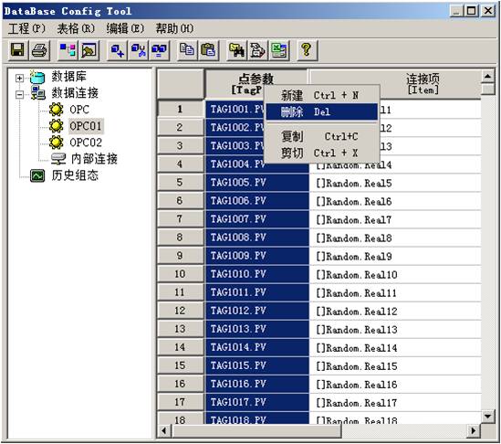 b. 清除分解設備上的數據連接項。在完成連接項備份後,在點組態的導航樹中找“數據連接”,再在它的下麵找要分解出去的設備(可以保留一個設備在原有的驅動上),選擇這個設備;在右側列中會出現與這個設備相關的連接項,點擊“點參數”列表頭,選擇所有點參數;單擊鼠標右鍵,在彈出菜單中選擇“刪除”,這樣即可清除與此設備相關的數據連接項。
