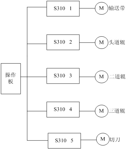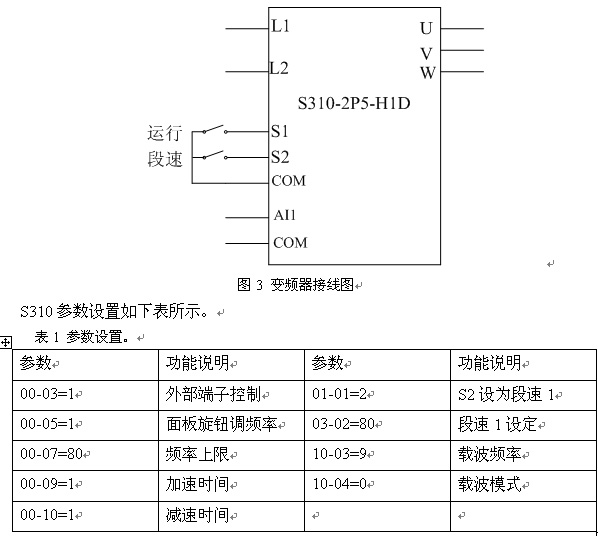 圖2 控製係統框圖 四、變頻器選型及參數設定 每台設備選用4~5台S310-2P5變頻器,分別控製輸送帶、頭道輥、二道輥、三道輥(部分機種可能沒有三道輥)、切刀,各帶一台0.4kw普通4極(ji)電(dian)機(ji)。采(cai)用(yong)麵(mian)板(ban)外(wai)拉(la),通(tong)過(guo)調(tiao)節(jie)變(bian)頻(pin)器(qi)運(yun)行(xing)頻(pin)率(lv)以(yi)及(ji)壓(ya)片(pian)空(kong)隙(xi)來(lai)調(tiao)節(jie)餅(bing)幹(gan)的(de)厚(hou)度(du)和(he)長(chang)寬(kuan),要(yao)求(qiu)在(zai)輥(gun)壓(ya)過(guo)程(cheng)中(zhong)各(ge)處(chu)的(de)流(liu)量(liang)相(xiang)等(deng),變(bian)頻(pin)器(qi)保(bao)持(chi)同(tong)步(bu)運(yun)行(xing)。下(xia)圖(tu)為(wei)S310接線圖。