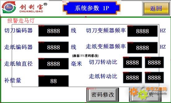 2.4“係統參數”:對切刀編碼器、走紙編碼器、走紙直徑、切刀與走紙的變頻器頻率以及轉動燈參數的設定。
