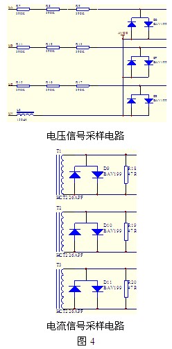 基於成本、內部空間和0.5 級精度設計的綜合考慮,電壓信號采樣選用電阻網絡分壓的方式,電流信號采樣選用電流互感器加電阻取樣的方式,並都采用二極管 BAV199 作箝位保護,其原理如圖 4 所示。