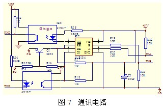 儀表具有一路 RS485 通訊接口,采用 Modbus-RTU 協議,所有測量得到的數據和脈衝能量都可通過此端口進行遠傳。硬件設計采用高速光耦 6N137 和 485 芯片 SN75LBC184 , 其電路如圖 7 所示。