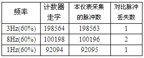 對儀表進行了脈衝接收對比試驗:將信號發生器分別連接到計數器和本儀表,使信號發生器輸出電壓幅度為4V 、占空比為 60% 的方波脈衝,分別在頻率 3Hz 、 8Hz 、 1Hz 的條件下,測試儀表脈衝采集情況,結果如下所示。