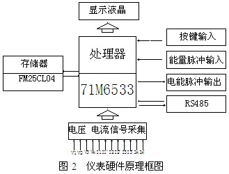 基於產品功能考慮,結合外型結構、生產及調試維修操作方便等因素,將硬件劃分分為處理器、電壓電流信號采集、存儲器、顯示液晶、按鍵輸入、能量脈衝輸入、電能脈衝輸出、通訊等部分。其中,信號采集部分將電網電壓、電流信號整定到71M6533 所允許輸入的範圍之內,存儲器采用非易失性鐵電存儲器 FM25CL04 ,其原理框圖如圖 2 所示。