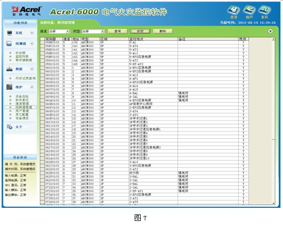 該管理功能隻有“係統管理級”可進行操作,“係統管理級”權限登錄係統後,通過點擊【維護】菜單下的“探測器管理”可進入如下圖所示的探測器管理界麵。該界麵可修改各通道所對應的通訊端口、通訊速率及使用狀態,軟件界麵如圖7所示: