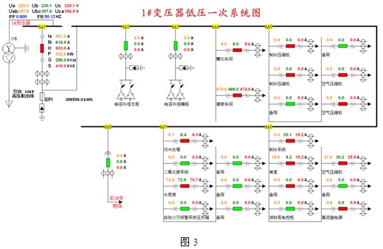 4.2配電係統一次示意圖: 10kV和0.4kV配電室配電回路運行狀態使用一次圖形式顯示回路的電壓,三相電流、有功無功功率、功率因數和頻率,界麵如下圖2、3、4所示: