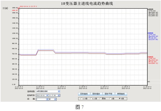 4.4趨勢曲線:Acrel-2000電力監控係統提供了實時曲線和曆史趨勢兩種曲線的分析界麵,通過調用回路實時曲線界麵分析該回路的負荷運行狀況;如ru通tong過guo調tiao用yong某mou配pei出chu回hui路lu的de實shi時shi曲qu線xian可ke分fen析xi該gai回hui路lu的de電dian氣qi設she備bei所suo引yin起qi的de信xin號hao波bo動dong情qing況kuang。係xi統tong的de曆li史shi趨qu勢shi即ji係xi統tong對dui所suo有you已yi存cun儲chu數shu據ju均jun可ke查zha看kan其qi曆li史shi趨qu勢shi,方fang便bian工gong程cheng人ren員yuan對dui監jian測ce的de配pei電dian網wang絡luo進jin行xing質zhi量liang分fen析xi,如ru下xia圖tu7所示: