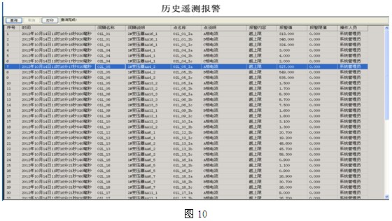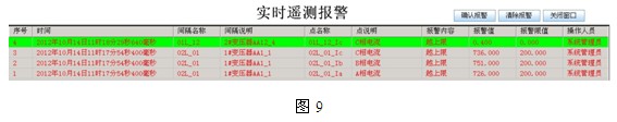 4.6報警提示和查詢界麵:電力監控係統實時和曆史報警界麵,實時報警會彈出報警窗口提示,曆史報警通過查詢得出,如下圖9、10所示:
