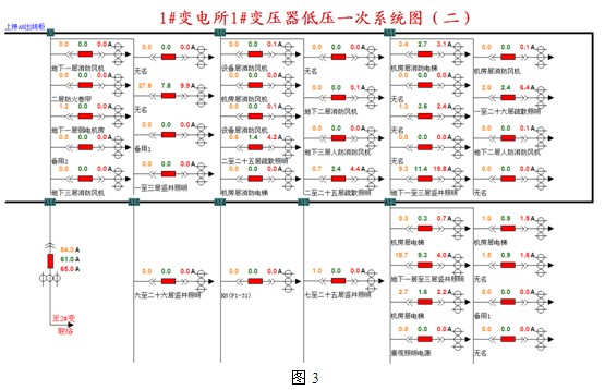 4.1配電係統一次示意圖: 0.4kV配電室配電回路運行狀態使用一次圖形式顯示,:0.4kV回路的母線電壓,進線、母聯或發電機雙切回路的三相電流、有功無功功率、功率因數和頻率;各饋線回路的三相電流和剩餘電流。界麵標注回路編號、用途、斷路器編號、互感器變比,回路用途可由擁有管理員權限的用戶修改。0.4kV回路界麵如下圖2、3所示: