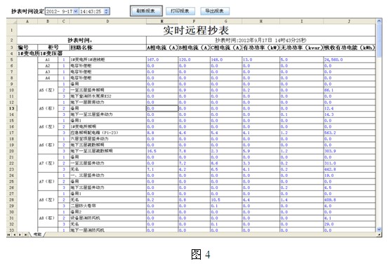 4.2報表功能:通過報表功能可以查詢任意時刻主要回路的全常規電參量數據、低壓回路的用電量、低di壓ya饋kui線xian回hui路lu的de漏lou電dian流liu值zhi和he配pei電dian線xian纜lan溫wen度du值zhi。用yong戶hu主zhu要yao關guan注zhu的de是shi用yong電dian量liang報bao表biao,用yong電dian量liang報bao表biao用yong於yu對dui租zu戶hu進jin行xing電dian費fei收shou費fei計ji量liang以yi及ji與yu供gong電dian局ju數shu據ju核he對dui後hou進jin行xing成cheng本ben核he算suan,如ru下xia圖tu4、5所示;