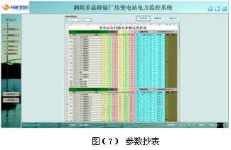 參(can)數(shu)抄(chao)表(biao)功(gong)能(neng),主(zhu)要(yao)對(dui)低(di)壓(ya)各(ge)出(chu)線(xian)回(hui)路(lu)的(de)電(dian)參(can)數(shu)進(jin)線(xian)查(zha)詢(xun)。支(zhi)持(chi)任(ren)意(yi)時(shi)刻(ke)電(dian)參(can)數(shu)查(zha)詢(xun),具(ju)備(bei)數(shu)據(ju)導(dao)出(chu)和(he)報(bao)表(biao)打(da)印(yin)等(deng)功(gong)能(neng)。該(gai)報(bao)表(biao)查(zha)詢(xun)供(gong)變(bian)電(dian)所(suo)內(nei)6台變壓器出線各低壓回路的電參數,主要包括:三相電流、有功功率和有功電度及變壓器溫度。該報表各回路名稱和數據庫關聯,方便用戶修改回路名稱。見圖(7)。