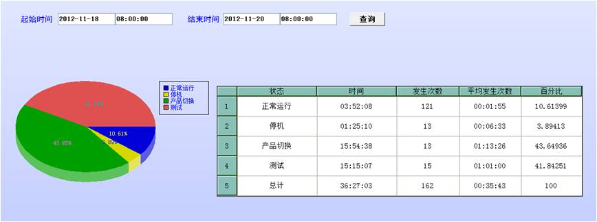 生產狀態報表:能夠查詢某一時間範圍內的各種狀態發生的起始時間,並按狀態類型給出全局對比,給出某一狀態在該時間段內發送的總時間、發送的次數、平均發生時間和時間的百分比對比。