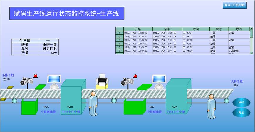 實時狀態畫麵:顯示單條生產線的實時運行狀態,包括各個打包階段的產出數量,剔除數量,設備狀態等;另外實時顯示當前生產的班次、品種和最終產量。