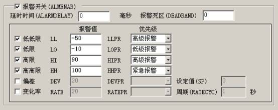 新建一工程,命名為“報警示例”,bingjinruzutaihuanjing。zaizutaihuanjingzhongjiangdaohangqiqiehuandaoshujukuye,shuangjidianzutaixiangmu,danchudianzutaiguanliduihuakuang。zaizutaiguanliduihuakuangdeyoucedianliebiaozhongyongshubiaoshuangjiyikongbaixing,zaidanchudeduihuakuangzhongxuanzemoniIO點並點擊“繼續”按鈕,彈出點定義對話框。在點定義對話框的上方點名欄裏輸入AI101作為點名,在下方的量程下限和量程上限處分別填入-100和100。將對話框切換到報警參數頁,選中報警開關複選框,此時下方的限值和偏差變化率等選項可用。選中低低限、低限、高限和高高限複選框,並把限值設為-50、-10、90和100,對應的報警優先級設定為高級報警、低級報警、高級報警和緊急報警,如下圖所示: