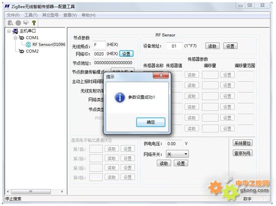 E、設備地址:1~F7 可設,可通過設備地址來區分數據來源與節點地址功能類似。設置完成後單擊後麵的“設置”按鈕,返回提示對話框,如圖6-8 所示,參數設置成功!!,單擊“確定”按鈕;