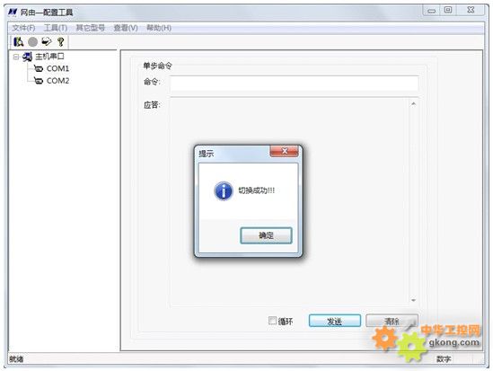 6、對於JZH-XXX-12 係列產品請接通外部電源,對於JZH-XXX-D 係列產品請用磁鋼在複位感應區滑動複位,軟件提示“切換成功!!!”如圖6-5 所示;(一閃就過,不用單擊確定)