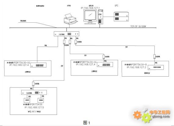 對藍礬化工管理方提出的需求和我們確定的組網方案,站控管理層設備層采購DELL主機,三星19寸顯示器,SANTAK的UPS;網絡通訊層使用MOXA的NPORT5630-8串口服務器和MS1102的光電轉換器以及3C16470的網絡交換機;現場設備層采用上海安科瑞公司PZ96-E4係列網絡電力儀表,總線鋪設屏蔽雙絞線,以滿足係統組網的要求。