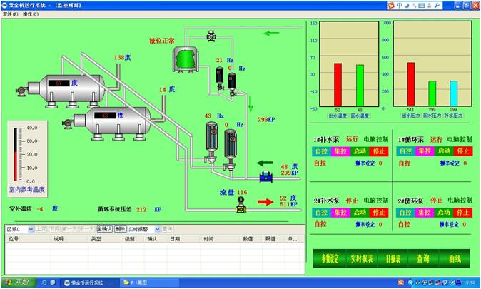 這些設備由一台操作站來監控。軟化水箱的超高和 超低水位、係xi統tong超chao溫wen超chao壓ya信xin號hao在zai操cao作zuo台tai產chan生sheng報bao警jing信xin息xi。操cao作zuo人ren員yuan通tong過guo監jian控kong畫hua麵mian很hen方fang便bian地di了le解jie設she備bei運yun行xing狀zhuang態tai,並bing可ke通tong過guo該gai畫hua麵mian手shou動dong控kong製zhi調tiao節jie設she備bei的de運yun行xing。重zhong要yao的de參can數shu可ke切qie換huan到dao曲qu線xian窗chuang口kou,便bian於yu觀guan察cha分fen析xi。