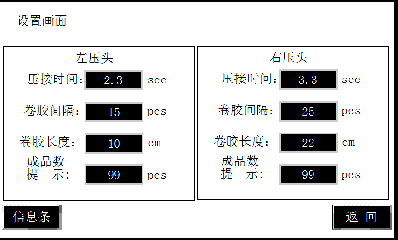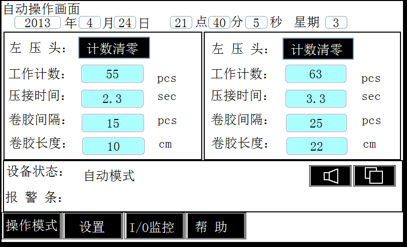 通過位於該設備右上角的維控人機界麵可以設定相關參數如壓接時間、卷膠間隔、卷膠長度等,顯示報警信息,設備另外兩種運行模式:手動模式、測試模式亦是在觸摸屏上麵操作。