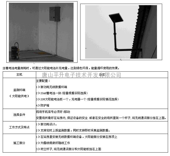 2.6.2太陽能電源供電方案 使用太陽能供電適用於有站房的監測井,太陽能電源分為三部分,太陽能電池板、太陽能充電控製器、鉛酸蓄電池。根據現場用電設備(包含微功耗測控終端與現場采集設備)的功率來選擇光電池板的大小與蓄電池的容量。 下麵為計算方法。 太陽能板配製計算方法: 電池板配置功率(W)=設備功耗(W)×每天工作時間(小時)×1.2(安全係數)÷[5小時(每天有效工作時間) ×0.6(充電效率)] 蓄電池配置計算方法: 蓄電池配置容量(Ah)=設備功耗(W)×每天工作時間(小時)×陰雨天(天數)÷[設備供電電壓(V) ×0.6(供電效率)]