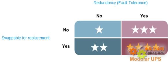 在係統可用性方麵,「模塊化係統」具備可替換性以及備援(容錯)設計,因此可提供最高等級的可用性。由於UPS(不斷電係統)是數據中心可能的單點故障來源,因此必須考慮如何將模塊化概念套用至UPS設計中。