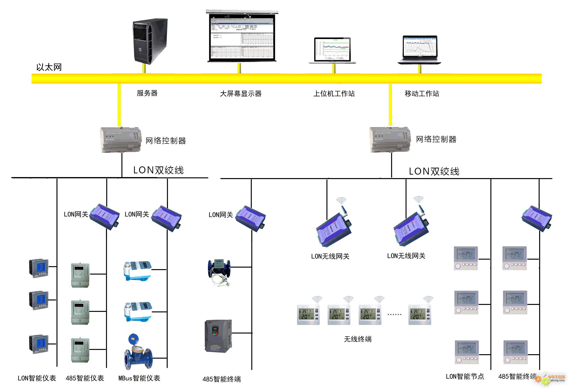 LonWorks網絡技術建築能源管理係統典型網絡結構圖如下: