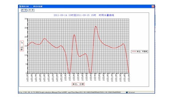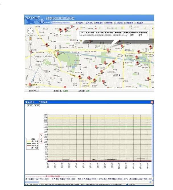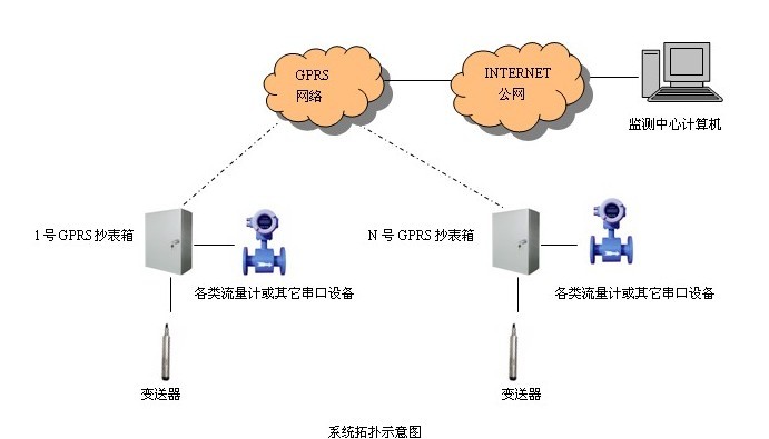一、客戶需求 將現場計量儀表及變送器的數據通過GPRS無線通訊的方式傳輸到抄表中心,在抄表中心對數據進行統一彙總、分析,為管理及收費提供依據。流量計遠程數據采集與監控廣泛適用於水利、熱力、燃氣、石油、工礦企業等行業用戶。 二、解決方案 1、係統組成 流量計遠程數據采集與監控由抄表中心、通信網絡、現場抄表設備、現場計量測量及控製設備四部分組成。 抄表中心:由中心服務器、上位機抄表軟件等組成。 通信網絡:公網寬帶(固定IP)+ 中國移動GPRS網絡,支持其它常用組網形式。 現場抄表設備:GPRS抄表終端(市電供電);不具備市電供電條件的現場,可選用太陽能供電+GPRS低功耗測控終端或電池供電型GPRS微功耗測控終端。 現場計量測量及控製設備:各種流量計、各類變送器、PLC設備等。  2、中心配置 抄表中心設備由數據服務器及上位機軟件組成。服務器上安裝操作係統軟件、數據庫軟件、抄表係統軟件。軟件采用B/S結構設計,具備係統信息管理、基礎信息管理、數據查詢管理、統計報表、分析曲線、高級分析管理等功能,也可根據用戶需要修改或增加功能。 ----軟件界麵展示----