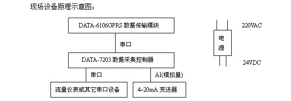 (2)現場計量儀表、變送器輸出為串口或4-20mA模擬量信號: DATA-6106GPRS數據傳輸模塊:1套。(產品功能:將串口接收到的數字信號,通過GPRS網絡傳輸到中心服務器上。) DATA-7203水資源控製器:1套。(產品功能:采集流量儀表或變送器的輸出信號;同時具備8位數碼顯示,可現場察看。) 其它配件:(開關電源、空開、插座、接線端子等):1套。 金屬防護箱:1套。