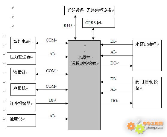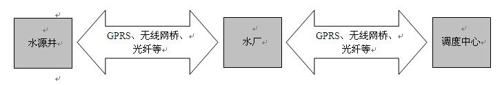 一 、概述: 地di下xia水shui一yi般ban通tong過guo水shui源yuan井jing提ti取qu並bing輸shu送song到dao水shui廠chang。水shui源yuan井jing遠yuan程cheng測ce控kong係xi統tong是shi城cheng市shi供gong水shui遠yuan程cheng監jian控kong與yu調tiao度du管guan理li係xi統tong中zhong的de子zi係xi統tong。調tiao度du中zhong心xin工gong作zuo人ren員yuan可ke以yi遠yuan程cheng監jian控kong水shui源yuan井jing設she備bei工gong作zuo情qing況kuang,水shui源yuan井jing管guan理li人ren員yuan可ke以yi遠yuan程cheng控kong製zhi水shui源yuan井jing設she備bei。 二、係統組成: 係統主要包括:調度中心服務器、水廠值班室計算機、水源井監控係統軟件、通信網絡、水源井遠程測控終端、水泵啟動櫃、壓力變送器、流量計等。 三、組網通信方式: 方式一:水源井直接與主管水廠通信,每個水廠再與調度中心進行通信。