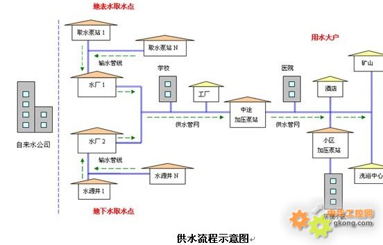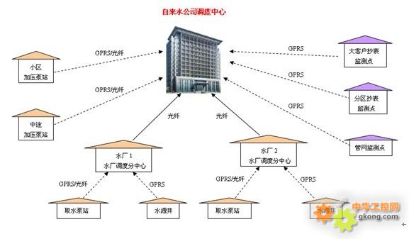 係統具體要求如下: 1、遠程監測取水泵站的取水口水位、取水泵站出水壓力和流量;監測取水泵組的運行狀態和電流、電壓等運行參數;遠程/自動控製取水泵組、閥門等設備的啟停。 2、遠程監測水源井的水位、出水壓力和流量;監測水源井水泵的運行狀態和電流、電壓等運行參數;遠程/自動控製水泵的啟停。 3、遠程監測水廠內蓄水池和清水池的水位、進出廠流量、出廠水質和壓力;監測水廠內配電設備、淨水設備和加壓泵組的運行狀態和運行參數;遠程/自動控製加壓泵組、閥門等設備的啟停;對水廠重要部位實施視頻監控。 4、遠程監測中途加壓泵站/小區加壓泵站的進站壓力或蓄水池水位、泵站出水壓力和流量;監測泵組的運行狀態和電流、電壓等運行參數;遠程/自動控製加壓泵組、閥門等設備的啟停。 5、遠程監測供水管網的供水壓力、流量、流向等信息。 6、遠程采集各區域用水總量數據;采集各用水大戶的用水量信息。 ---係統組成--- 為滿足上述功能需求,供水調度係統可建立兩級調度中心,即自來水公司調度中心和水廠調度分中心。 自來水公司調度中心建立在自來水公司辦公區內,對水源井、取水泵站、水廠、供水管網、加壓泵站進行統一監測;並根據用水狀況,調度各水廠、泵站的出水供給。 水廠調度分中心建立在各水廠內,針對所轄取水泵站、水源井和水廠內部進行實時監測和管理。
