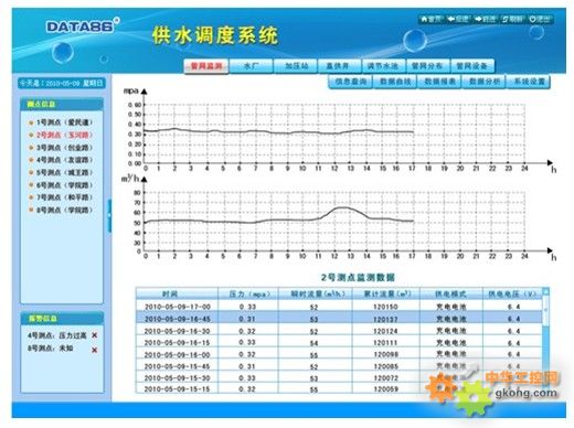 ---係統概述--- 該係統是一個綜合的供水信息化管理平台,可以將自來水公司管轄下的取水泵站、水源井、自來水廠、加壓泵站、供水管網等重要供水單元納入全方位的監控和管理。 借助該係統,供水調度中心可遠程監測各供水單元的實時生產數據和設備運行參數;可遠程查看重要生產部位的監控視頻或監控照片;可遠程管理水泵、閥門等供水設備。該係統的總體建設目標是實現工藝流程透明化、生產數據公開化和重要環節可視化,為供水工作的科學調度和安全生產提供可靠保障。