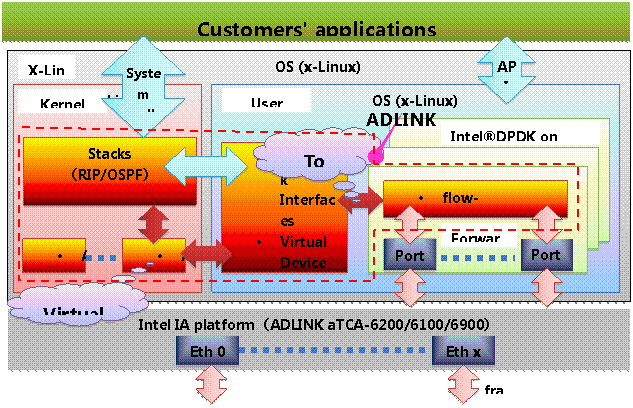 DPDK(Data Plane Development Kit,數據平麵開發套件)是一個專為x86架構處理器提供的輕量級運行環境。它提供了低功耗和Run-to-Completion(RTC,運行到完成)模式,以此最大限度的提升數據包的處理性能。而且DPDK還包含了優化的和高效的函數庫,為用戶提供豐富的選擇,例如我們熟知的環境抽象層(EAL,Environment Abstraction Layer),它負責控製低級資源並提供優化的輪詢模式驅動(PMD,Poll Mode Driver),以及更高級別應用的完整API接口,圖7為軟件層級結構圖。