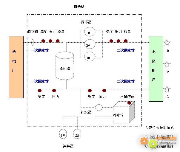 一、項目概況與需求: 某換熱站原有一套PLC監jian控kong係xi統tong,但dan目mu前qian係xi統tong已yi故gu障zhang,無wu法fa繼ji續xu使shi用yong。供gong熱re公gong司si欲yu建jian立li一yi套tao新xin的de換huan熱re站zhan監jian控kong係xi統tong,遠yuan程cheng控kong製zhi係xi統tong,以yi恢hui複fu換huan熱re站zhan的de監jian控kong功gong能neng並bing升sheng級ji實shi現xian供gong熱re公gong司si對dui所suo屬shu各ge換huan熱re站zhan的de全quan麵mian遠yuan程cheng監jian控kong。 1.1 工藝流程示意圖: