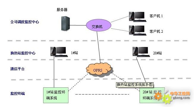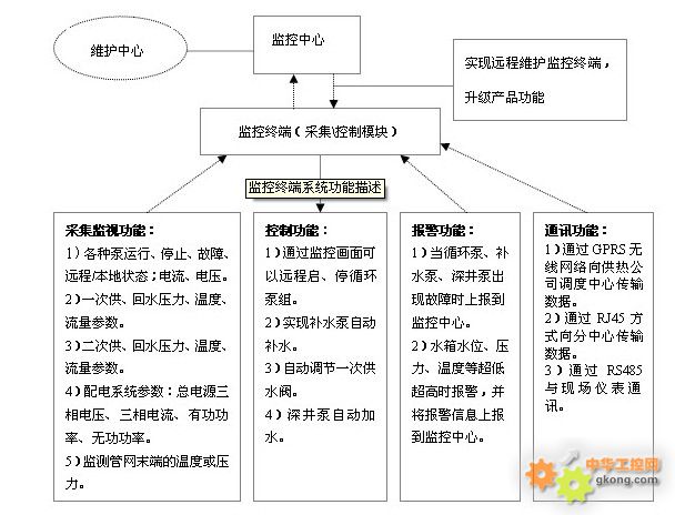 三、監控中心 3.1 公司調度監控中心 監控中心設立在供熱公司,充分利用其現有網絡資源及軟硬件設施,對其進行完善,並增設服務器係統設備、工作站係統設備,建立統一的供熱實時監控與管理係統。 3.1.1 係統組成 (1)中心機房信息彙集平台係統 信息彙集平台是係統數據通信、信息處理和服務的核心,主要由服務器係統、數據庫係統、通訊服務軟件、通信網絡係統等組成。 (2)工作站應用係統 應用係統是為工作人員提供相關信息的服務係統,是整個係統的建設的目的,包括軟件係統、顯示係統配置、計算機配置及網絡的建設。 3.1.2 應用軟件功能設計 (1)采用B/S和C/S兩種結構相結合:係統的設計是基於GPRS數據傳輸技術和網絡技術之上的,軟件開發采用B/S和C/S兩種結構相結合的方式設計,同時支持Web訪問、客戶端軟件訪問模式設計,方便不同職能部門的工作人員工作。 數據彙集處理和前端控製程序等應用係統采用C/S體係結構。監控調度人員使用客戶端軟件訪問係統完成所有操作,采用C/S體係結構。其他非監控類人員使用瀏覽器訪問係統完成所有操作,采用B/S體係結構。 (2)實現對28個換熱站設備運行情況、相關運行參數的實時監控,以及重要管網測點溫度、壓力數據的在線監測。 (3)實現對全部數據的分析、存儲、預警與報表統計、曲線分析輸出功能。 (4)實現對測點各種機電設備設施情況、維護情況規範化建檔管理。 (5)實現係統權限管理、安全管理、日誌記錄管理功能。 (6)電子地圖可視化界麵顯示。 3.2 換熱站監控中心 換熱站監控中心設立泵站值班室,建立簡易中心,為信息彙集平台係統、應用係統提供軟硬件技術支持。 換熱站監控中心應用軟件功能設計如下: (1)實現對無人值守換熱站設備運行情況、相關運行參數的實時監控。 (2)實現對全部數據的分析、存儲、預警與報表統計、曲線分析輸出功能。 (3)實現對測點各種機電設備設施情況、維護情況規範化建檔管理。 (4)實現係統權限管理、安全管理、日誌記錄管理功能。 四、監控終端係統 4.1 監控終端係統構成及功能框圖