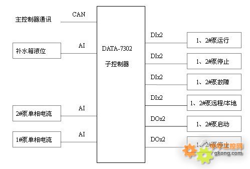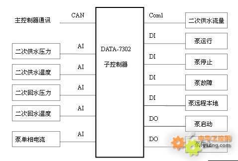 4.2 監控終端係統構成描述 監控終端係統主要由值班室監控終端櫃和深井泵監控終端箱組成。 值班室監控終端中DATA-7301主要負責上、下通訊和一次回路設備數據的采集和執行,有6個通訊端口,12路DI通道,6路AI通道,6路DO通道。通過RJ45端口與換熱站監控中心通訊;通過COM1 端口和GPRS發射模塊相連,經GPRS網絡與公司調度中心進行傳輸數據;通過COM2采集總電源智能電表和一次供熱流量計輸出的串口數據;通過COM3端口經通訊轉換器,將通訊數據輸出轉換成模擬量輸出4-20mA,控製執行器;通過CAN端口與子控製器DATA-7302的CAN端口相連組網。由模擬量AI通道采集一次供回水溫度、壓力、調節閥開度。 值班室監控終端中DATA-7302構成DATA-7301的子網,主要用於循環泵、補水泵、二次回路參數數據的采集和執行。有3個通訊端口,CAN端口用於對上組網通訊,COM1用於對現場串口設備數據采集如流量;還有20路DI通道,8路AI通道,8路DO通道。 深井泵監控終端箱中DATA-7302構成DATA-7301的子網,主要用於2台深井泵的數據采集和控製並可以由補水箱液位參與構成閉環控製。 4.3 值班室監控終端DATA-7302功能框圖