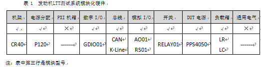 采用eCAR®汽車電子測試平台搭建發動機控製器LTT測試係統,測試係統選用的模塊化硬件見1: