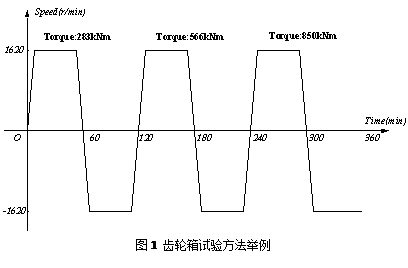 風電測控係統將兩個齒輪箱產品放置在步進電機主軸的兩側同時進行檢測,依靠步進電機的帶動模擬齒輪箱實際工作狀況。按照圖1所示,分為三個階段驅動電機運行,第一個階段給齒輪箱加載283kNm的負載,電機首先以1620r/min的轉速正轉60分鍾,然後再以同樣的速度反轉60分鍾,如此重複三次,每次加載不同的負載,第二三階段的負載分別為566kNm、850kNm。電機穩定運行狀態下,檢測環境參數及振動噪聲相關指標,評定齒輪箱產品質量。